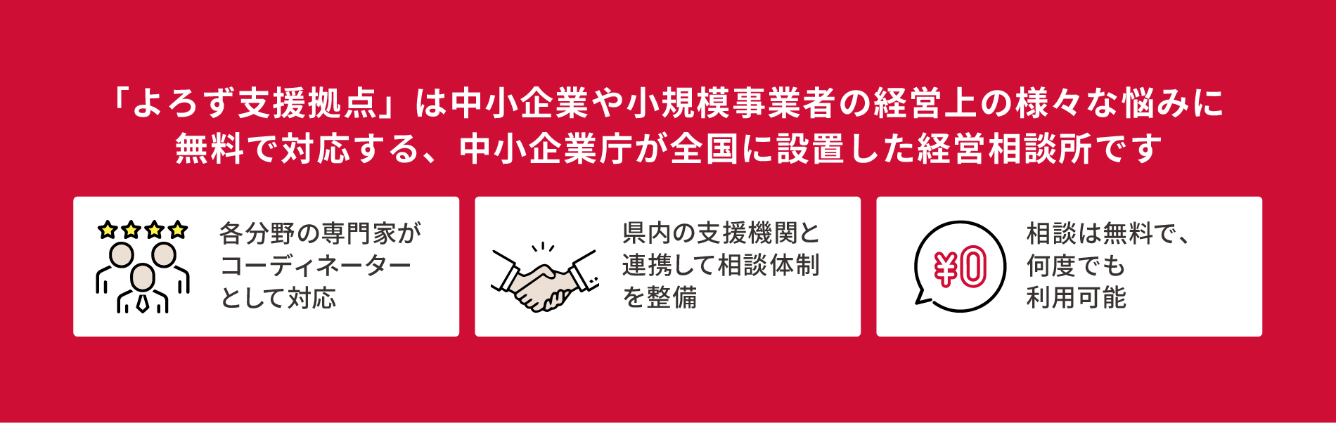 よろず支援拠点では、広く中小企業・小規模事業者の皆様(NPO法人・一般社団法人・社会福祉法人等の中小企業・小規模事業者に類する方、創業予定者を含む)の相談に応じ経営課題を分析することで売上拡大につながる経営相談サービスの提供を行います。