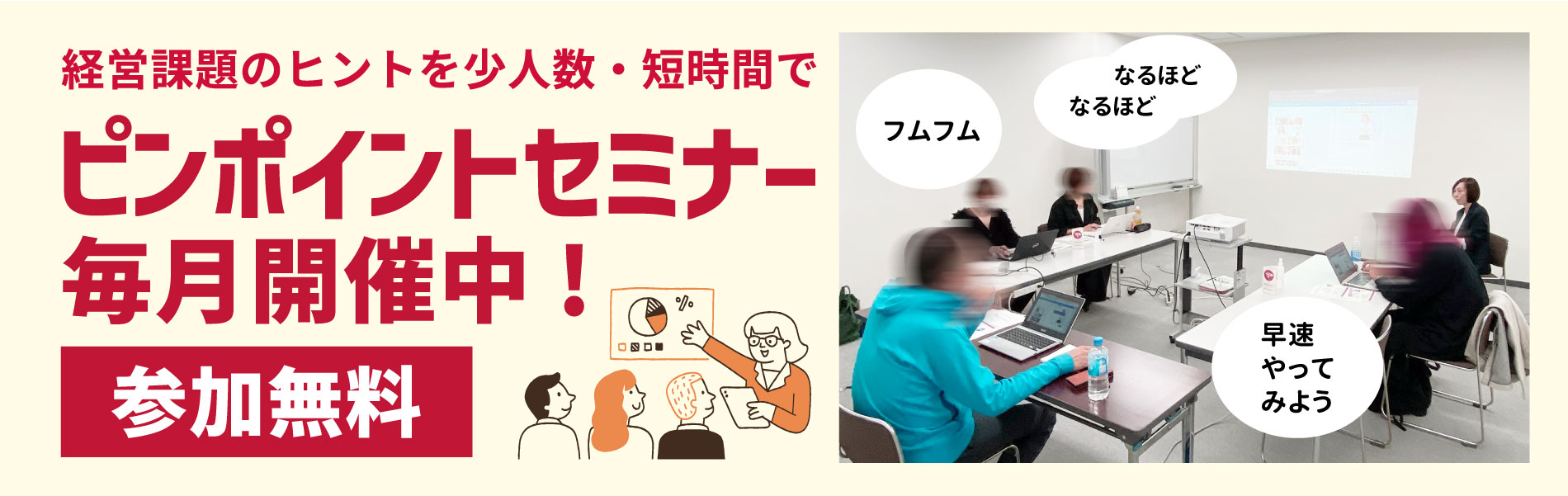 よろず支援拠点では、県内市町村、公的支援機関等と連携して事業者向けのセミナーに講師として各コーディネーターを派遣したりイベントのサポート等を行っています。